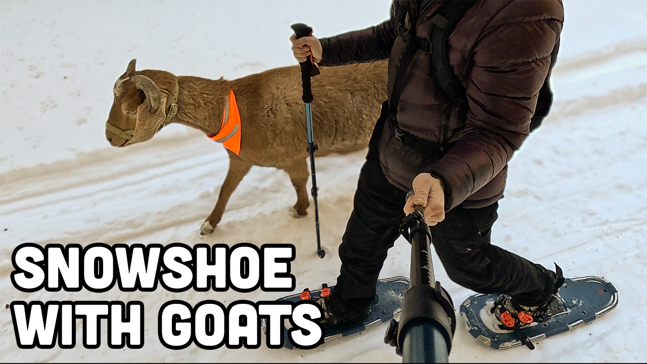 Snowshoeing with two pet goats on Retrospec Drifter Snowshoes.