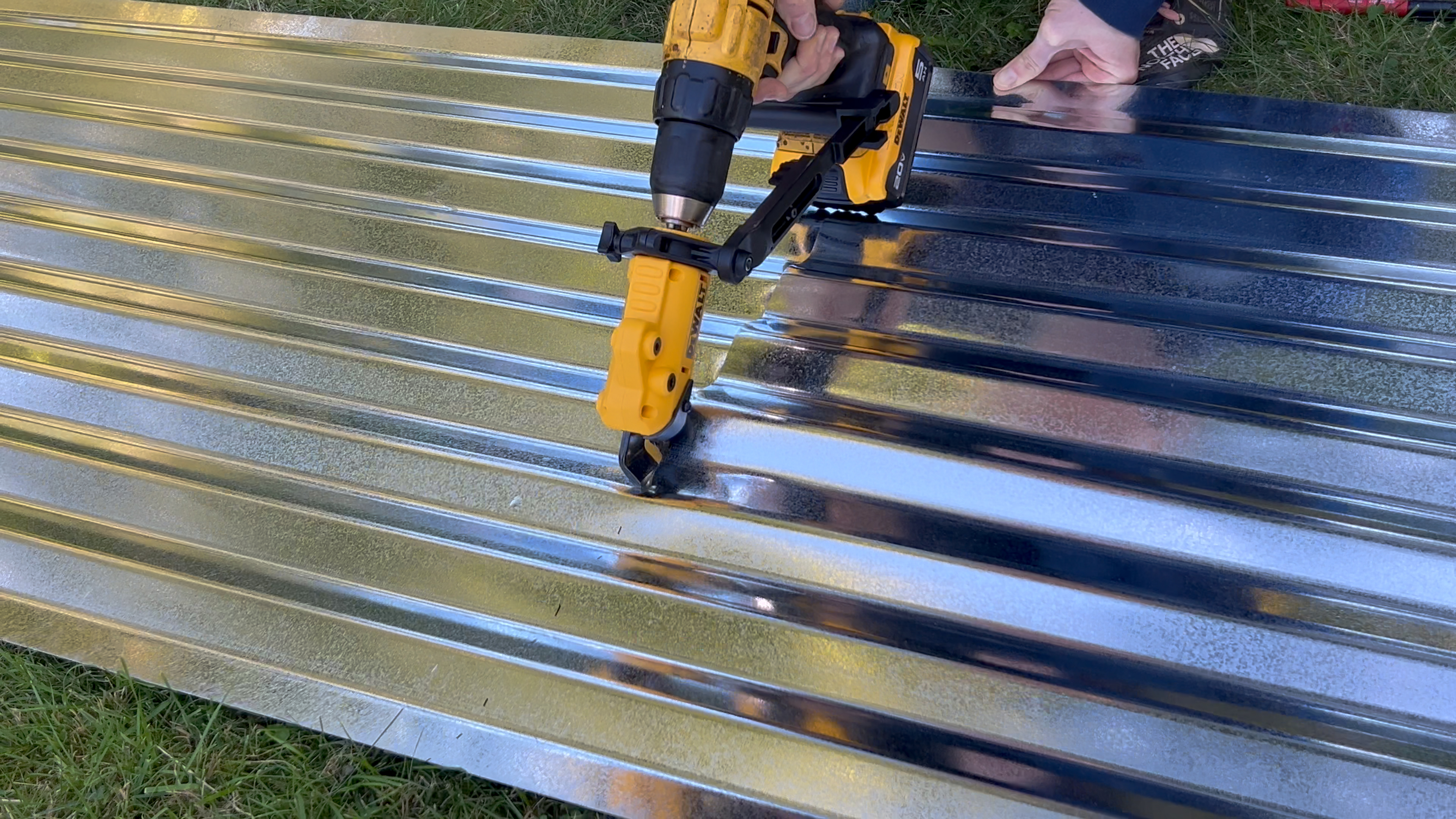 The drill powered Dewalt metal shear cutter nibbler makes short work of cutting 31 gauge galvanized metal roofing panels. The cuts perpendicular to the ribs was very clean. The cuts parallel to the ribs was acceptable but not as nice - plan to hide this edge under and overlap if possible.
